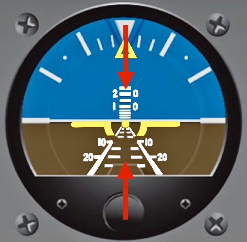 • Pegging at 25° pitch up or down, misleading you to thinking the aircraft is still within normal limits.